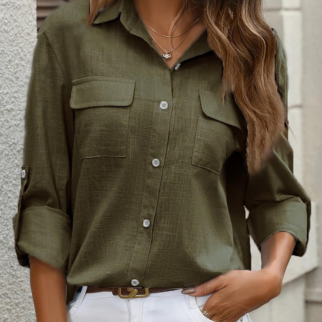 Die Damenbluse Mit Taschen | Langärmlig ist ein Oberteil mit klarer Linienführung, durchgehender Knopfleiste und einer einheitlichen Oberfläche. Zwei aufgesetzte Taschen ergänzen die Vorderseite und strukturieren das Design. Die Bluse eignet sich für verschiedene Freizeit- und Alltagsoutfits und kann mit Jeans, Stoffhosen, Röcken oder leichten Jacken kombiniert werden.